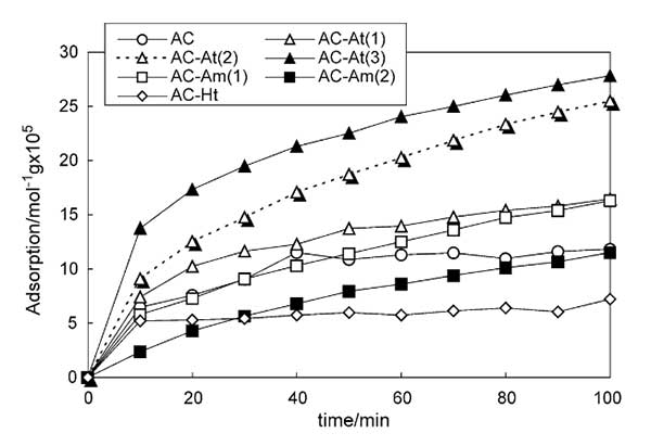 實(shí)驗(yàn)條件:在N2中使用210ppm的甲硫醇作為甲硫醇?xì)怏w;钚蕴康闹苽洌钚蕴客ㄟ^(guò)碳化隨后活化制備。用蒸汽進(jìn)行活化。用HNO3/H2SO4溶液進(jìn)行活性炭的酸處理。將1克活性炭在100立方厘米HNO3/H2SO4溶液中在室溫下攪拌0.5小時(shí)。過(guò)濾分離經(jīng)過(guò)處理的活性炭,并在超聲條件下用去離子水洗滌數(shù)次,直到水的pH值達(dá)到5以上。然后將活性炭在100℃空氣中干燥12小時(shí),在150℃下真空干燥1小時(shí)。用HNO3,HNO3/H2SO4(1/1比例)和HNO3/H2SO4(1/3比率)處理的活性炭分別表示為AC-At(1.2.3)。胺化合物對(duì)活性炭的改性通過(guò)十六胺的吸附來(lái)進(jìn)行。將活性炭浸入十六烷胺/乙醇溶液中并在室溫下攪拌30分鐘。然后過(guò)濾分離活性炭并在室溫下真空干燥2小時(shí)。由4×10-6和3.3×10-5摩爾m-3十六胺溶液制備的活性炭分別表示為AC-Am(1.2);钚蕴(AC-Ht)的熱處理在Ar氣氛中在600℃下進(jìn)行2小時(shí)。