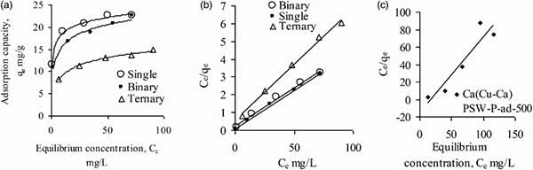 圖2.初始pH值為5的活性炭的三元溶質(zhì),Cu(II),Ni(II)和Pb(II)的Langmuir非線性(a),線性(b)和Freundlich(c)等溫線而它們的初始濃度變化,從<0到≤600mg L-1。(分析Ni樣品的濃度范圍高達305mg L -1)。