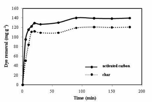 圖3:接觸時(shí)間對(duì)活性炭吸附甲基紫的影響(條件:初始濃度=100mg L-1,pH=9,活性炭劑量=0.6g L-1)。