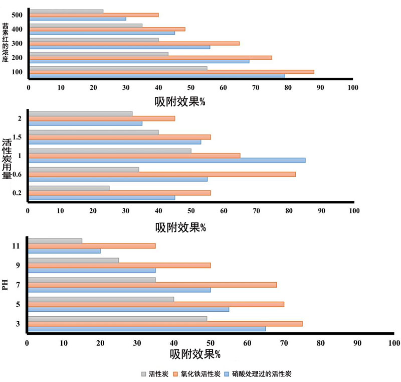 圖2:溶液pH,活性炭用量,染料初始濃度對活性炭,處理過的活性炭和氧化鐵活性炭納米復(fù)合物吸附茜素紅S的影響。
