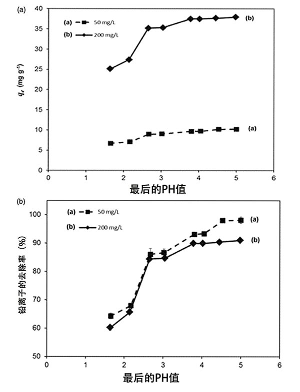 圖3.pH對活性炭明膠復合材料對鉛離子吸附的影響;钚蕴棵髂z復合材料劑量0.15g/50ml,溫度23±2℃,鉛濃度(a)50mgl-1和(b)200mgl-1。