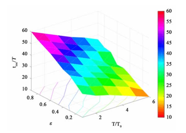 所有參數(shù)空間在孔隙度和溫度方面的綜合研究如圖4所示。我們可以看到,較高的孔隙率和較低的溫度將導致反應器中吸附物的停留時間更長。較高的溫度會導致更快的吸附速率,但會降低活性炭吸附劑的吸附能力。