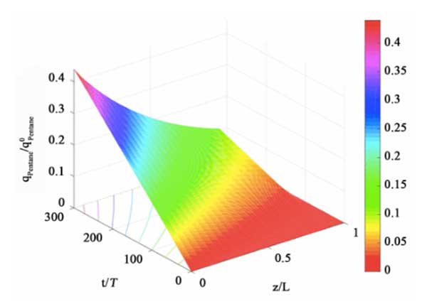 在圖5中,我們顯示了戊烷在活性炭上的吸附負載的時空分布。戊烷是油蒸氣中的主要成分之一。由于我們假設活性炭在吸附過程中處于恒溫狀態(tài),且油蒸氣濃度很低,因此線性驅(qū)動力模型可以很好地模擬吸附質(zhì)的吸附動力學。可以以相同的方式模擬油蒸氣中的其他組分。