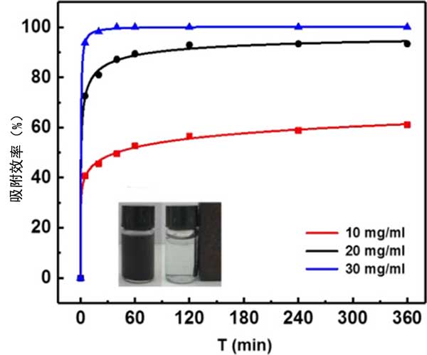 圖1.不同量的活性炭[10mg(紅線)20mg(黑線)30mg(藍(lán)線)]對DBT的吸附效率。