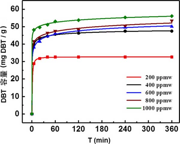 圖2.在不同硫初始濃度下活性炭對DBT的吸附容量。
