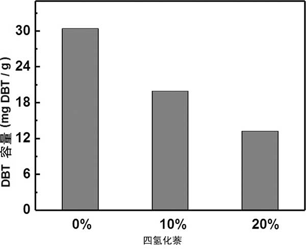 通常,燃料中的芳族分子和含硫化合物阻礙吸附劑向目標(biāo)分子的選擇性吸附。因此,應(yīng)詳細(xì)研究這些化合物的影響,以實(shí)現(xiàn)深度脫硫。因?yàn)榉枷阕宸肿犹烊淮嬖谟谌剂现,所以在芳香族分子共存的情況下有效去除DBT是一個(gè)迫切的問題。通過活性炭研究了在四氫化萘存在下DBT的吸附去除。圖4表明通過增加四氫萘的比例可以降低吸附容量,這可能是因?yàn)镈BT和四氫萘在吸附過程中相互競爭。當(dāng)四氫萘的百分比達(dá)到10%時(shí),觀察到DBT吸附容量從30.42下降到19.94mg DBT/g,當(dāng)四氫萘的比例從10%增加到20%時(shí),DBT吸附量下降相對較慢。觀察到19.94至13.25mg DBT/g。這種抗干擾現(xiàn)象優(yōu)于報(bào)道的使用氮化硼作為吸附劑的結(jié)果,其中在干擾物質(zhì)存在下DBT吸附性能降低了23%。在四氫化萘存在下降低的吸附容量可歸因于四氫化萘易于與活性炭中的碳平面形成π-π相互作用。