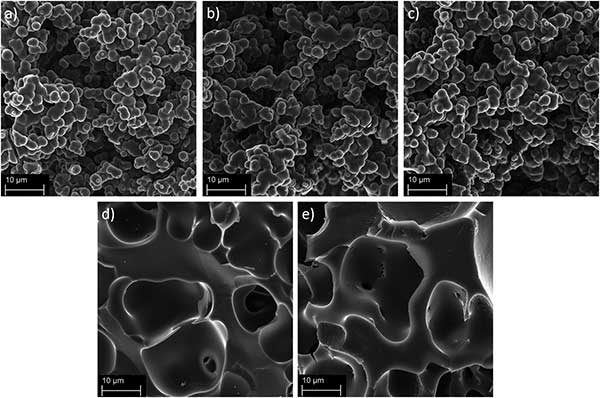 通過掃描電子顯微鏡對高比表面積活性炭進行表征于圖2a-c中。可以看出的是這幾種活性炭具有它是由球形碳顆粒的尺寸與周圍3μm的孔隙網(wǎng)絡(luò)結(jié)構(gòu),這是典型的基于甲醛樹脂活性炭。球形活性炭納米顆粒的燒結(jié)導致孔隙網(wǎng)絡(luò)內(nèi)的空腔,其在直徑為2至20μm的形成;钚蕴勘砻媸枪饣,沒有燒結(jié)的球形活性炭納米顆粒,而它們?nèi)匀辉诰W(wǎng)絡(luò)內(nèi)具有相似直徑的空腔。由于在化學活化之前低的預碳化溫度,球形納米顆粒在活化過程中強烈聚集,這導致如前所述的較不剛性的孔隙網(wǎng)絡(luò)。