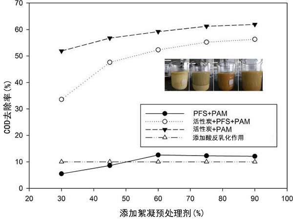 凝結(jié)劑的組合有效地降低了油滴之間的靜電排斥并加強了油和水的分離。凝結(jié)劑的一些組合可以改變油滴上的電荷,產(chǎn)生再穩(wěn)定化或膠體凝結(jié)劑現(xiàn)象,導(dǎo)致切削液COD穩(wěn)定或增加。實驗結(jié)果的分析表明,活性炭+PAM的處理效果比較好。