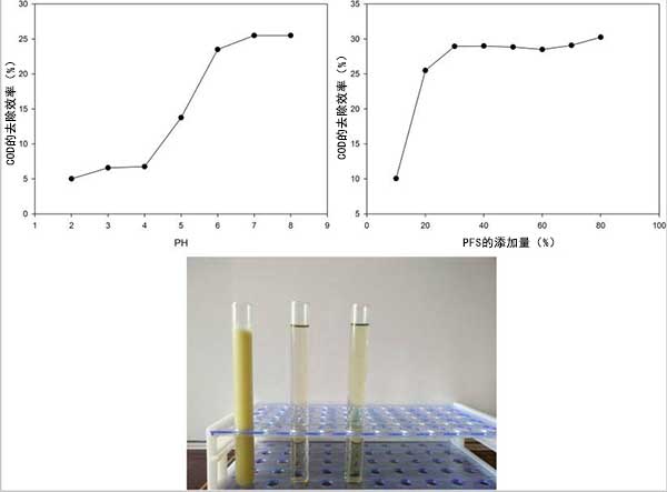 在活性炭負載鐵離子的初級絮凝預(yù)處理后,濾液含有少量雜質(zhì)。研究了PFS絮凝劑對過濾廢物的影響。使用單因素實驗選擇pH值和PFS添加量(圖3a,b)。原始溶液與初級和次級絮凝后的溶液的視覺比較顯示在圖3c中。