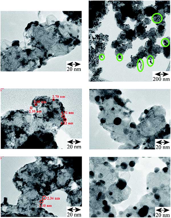 活性炭負(fù)載鈀催化劑的TEM比較顯示在圖1。左:原始活性炭,右頂部和中部:在300°C和底部:400°C下進(jìn)行碳熱處理后,這會(huì)導(dǎo)致活性炭的顆粒增長(zhǎng),但之后聚集體大部分缺失孤立的較大平均尺寸增大的鈀微晶留在活性炭表面。右上:在300℃處理后的活性炭負(fù)載鈀的調(diào)查圖像,其中的橢圓形綠色標(biāo)記突出顯示在400℃催化劑上不存在的殘余聚集體。顯示貴金屬實(shí)體的形狀,尺寸和形態(tài)之間的明顯差異。對(duì)于活性炭負(fù)載鈀,在多孔高表面積活性炭載體上/中存在大部分分離的初級(jí)顆粒。對(duì)于活性炭催化劑,主要存在線性聚集鏈和支化聚集體,在表面具有一些聚集體。熱處理導(dǎo)致大部分分離的初級(jí)顆粒尺寸增大,僅剩下少量聚集體或附聚物。