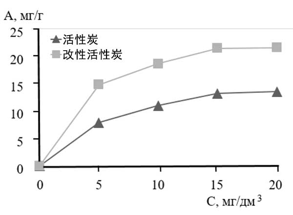用發(fā)煙硫酸處理活性炭導(dǎo)致磺酸鹽基團捕獲吸附劑表面和孔內(nèi)部。用二氯乙烷對活性炭的初級處理有利于磺化劑在孔深度中的滲透,從而增強氧化,并由此促進磺酸鹽基團的形成?咨疃戎谢撬猁}基團的存在增加了吸附劑相對于汞離子的吸附能力。對于改性活性炭在靜態(tài)條件下對汞離子吸附的研究結(jié)果,根據(jù)獲得的實驗數(shù)據(jù),繪制了活性炭和改性活性炭的比較等溫線(圖1)。