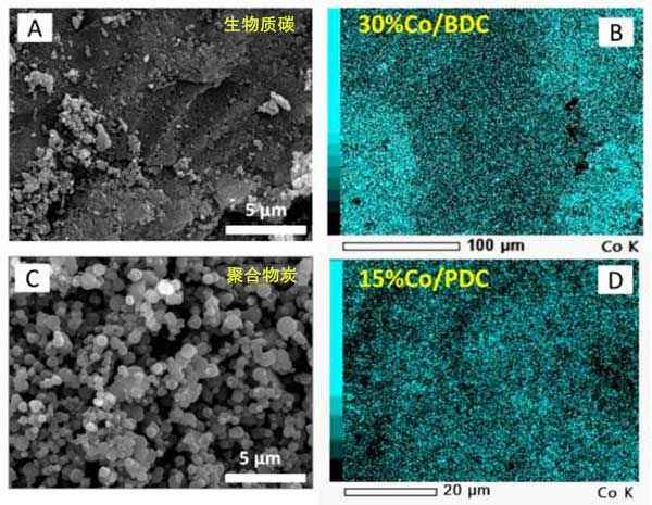 使用掃描電子顯微鏡(SEM)觀察由植物殼和酚醛樹脂的熱解獲得的活性炭的表面形態(tài),并分別在圖1A,C中示出。可以看出,不同的碳前體產(chǎn)生不同的表面形態(tài)。生物質(zhì)衍生的碳顯示出剛性和致密的結構,這是典型的木炭特征。而聚合物衍生的碳呈現(xiàn)具有粒子網(wǎng)絡的碳球,在球體之間產(chǎn)生大的空隙。然后將兩種活性炭用作氧化鈷的載體。為了觀察金屬氧化物在活性炭上的分散,進行了SEM與能量色散X射線(EDX)的元素映射。圖1B,D表示裝載在兩種材料中的氧化鈷的代表。所有都顯示鈷材料(在青色中顯示)在活性炭中的均勻分散。這表明通過浸漬方法中描述的簡單化學計量計算很好地實現(xiàn)了元素鈷的目標負載。換句話說,上述結果清楚地顯示了制備氧化鈷活性炭的成功制備步驟。