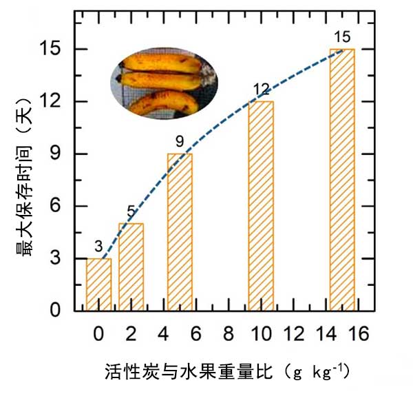 為了研究活性炭用量的影響,改變了活性炭和水果的質(zhì)量比。圖4顯示了活性炭與水果的保存時間與質(zhì)量比的范圍為。活性炭的量會影響保質(zhì)期,并且可以看到非線性相關性(見圖4中的虛線)。沒有活性炭達到存在,水果儲存時間僅為3天。根據(jù)添加的活性炭的質(zhì)量,保質(zhì)期可以從2天延長至12天。通過添加15克吸附劑用于1千克水果,可以實現(xiàn)延長高達5倍的保質(zhì)期。較高質(zhì)量的活性炭提供較長的保存時間,這可能是由乙烯吸附的活性位點含量較高引起的。結果表明,氧化鈷浸漬的活性炭有望用于延長水果的保質(zhì)期。