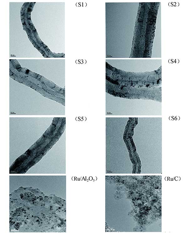 所有載釕活性炭上的釕負(fù)載量理論上為5%。通常,將活性炭加入120mL乙二醇中。并將混合物在超聲處理30分鐘以確保活性炭均勻分散。超聲處理后,在連續(xù)攪拌下滴加3.0mL RuCl 3水溶液30分鐘。然后是使用NaOH乙二醇溶液將混合物的pH調(diào)節(jié)至4.0。然后,在連續(xù)攪拌24小時后,將溶液放入微波合成反應(yīng)器中加熱100秒。過濾混合物溶液,用去離子水洗滌直至濾液的pH達到7.0,并在80℃下真空干燥。將樣品研磨成粉末使用。由于活性炭的表面是疏水的,它們傾向于在極性溶劑中聚集。并且由官能團改性的活性炭可以提供足夠的孔隙以使釕納米顆粒均勻地分布在活性炭的表面上。在通過微波加熱的多元醇方法制備活性炭負(fù)載的釕納米顆粒。合成過程如圖1所示。