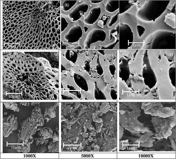 FESEM:三種活性炭在不同放大倍數(shù)下的顯微圖像顯示在圖3中。空果束活性炭樣品產(chǎn)生的蜂窩狀圖案孔隙網(wǎng)絡(luò)與優(yōu)化的碳納米管相似。油棕纖維活性炭上的孔也類似于空果束活性炭的蜂窩圖案。然而,與油棕纖維炭和棕櫚仁殼炭相比,空果束炭中的孔網(wǎng)絡(luò)更加突出和發(fā)展。棕櫚仁殼活性炭樣品顯示出很少的隧道孔,并含有阻塞毛孔的可見微塊。發(fā)達的多孔網(wǎng)絡(luò)表明可以沉積吸附物或離子的高表面積。