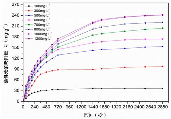 初始鉻黑T濃度對活性炭吸附的影響:用一系列鉻黑T水溶液(濃度:100.0-1200.0mg·L-1,體積:50mL)進行初始鉻黑T濃度效應(yīng)實驗。將溶液的pH調(diào)節(jié)至合適,然后將溶液加入3.00g·L-1活性炭中,并將混合物在25℃的溫度下在振蕩器上平衡48小時,定期取水樣,測量鉻黑T水溶液的濃度,并計算吸附的鉻黑T量。
