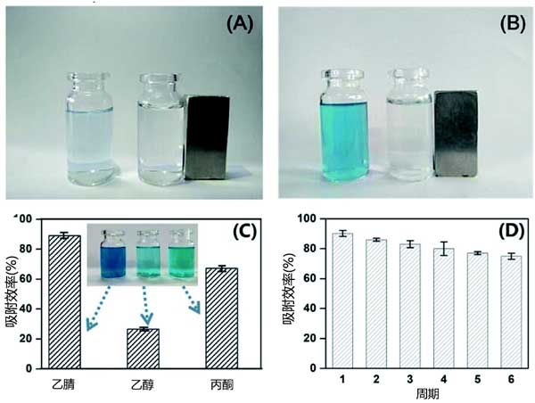 活性炭的回收和再利用是在實際應(yīng)用中需要考慮的關(guān)鍵因素。因此,我們調(diào)查了活性炭的恢復和可重用性。通過外部磁體很容易將活性炭與水溶液分離(圖3A和B)。通過使用乙腈,乙醇和丙酮作為洗脫液輔助超聲來再生裝載孔雀石綠的活性炭。乙腈的解吸效率優(yōu)于乙醇和丙酮,解吸效率分別為90.2%,35.7%和71.3%(見圖3C)。活性炭在解吸和再生后是穩(wěn)定的。此外,六個循環(huán)后沒有明顯的吸附效率損失(圖3D)。對活性炭的快速吸附,大吸附容量和良好的可重復使用性促使我們研究其實際應(yīng)用。將活性炭分散在含有加標孔雀石綠(25mg L-1)的廢水中。在用外部磁體快速吸附和分離活性炭后獲得澄清的上清液(圖3A和B)。結(jié)果表明,活性炭是一種經(jīng)濟有效的高性能吸附劑,用于孔雀石綠吸附和去除廢水。