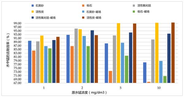 在最后一系列試驗(yàn)中,作為所進(jìn)行的工作的一部分,使用錳模型溶液進(jìn)行試驗(yàn)。在計(jì)算的基礎(chǔ)上,發(fā)現(xiàn)在通過活性炭的過濾過程中用磁場處理的樣品中錳的去除效率更高。各濾床上錳和對照水之間的錳去除效率差異(圖3)。另一方面,磁場的使用增加了水的飽和度,其中氧氣是Mn(II)氧化反應(yīng)為Mn(IV)所必需的。其他吸附材料具有化學(xué)惰性,因此通過使用磁場對水的物理和化學(xué)性質(zhì)的影響不會提高鐵和錳離子的效率。