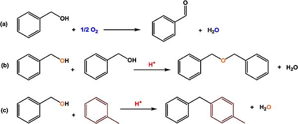 圖1所示,對于我們的銠活性炭催化劑,如果在布朗斯臺德酸中心存在下,芐醇氧化成苯甲醛可能發(fā)生平行反應:(a)苯甲醇氧化成苯甲醛(不需要酸中心)和副產物形成水。(b)兩分子芐醇縮合形成一分子二芐基醚,并除去水分子。(c)芐基化反應,包括從芐醇向甲苯分子中加入芐基碳陽離子(未顯示),并除去水分子以形成甲基-二苯基甲烷異構體等。
