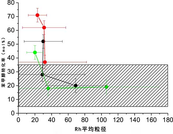 很明顯,這些粒徑范圍非常寬,我們認為考慮這樣的大顆粒對氧化反應具有活性是不現實的。在其它術語中,因子或參數是該預治療效果有在銠粒子的大小,但另外一個因素或參數是在銠粒徑變動的影響對催化活性。圖3值得注意的是,對于高于約的顆粒。30-40nm不再觀察到與催化轉化的變化或相關性,表明粒度不再是活性參數。我們認為該值是銠對芐醇氧化的活性的近似上限直徑,或者反過來對該反應有活性要求小于約30納米。我們認為這個結論雖然是一個廣泛的估計,但與未來基于這種金屬的催化劑開發(fā)相關。