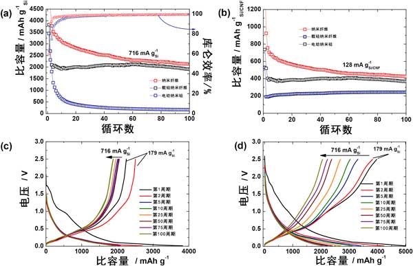 如圖4所示,從第一個(gè)循環(huán)的電壓分布中看出,兩個(gè)陽(yáng)極的第一個(gè)循環(huán)的額外貢獻(xiàn)來(lái)自不可逆的固體電解質(zhì)界面層形成和電解質(zhì)分解。對(duì)于電化學(xué)表征,在紐扣電池配置中使用鋰金屬作為對(duì)電極對(duì)所有硅陽(yáng)極進(jìn)行恒電流充電和放電。裸露的十億分之一硅陽(yáng)極在第一個(gè)循環(huán)中提供3445mAhg的放電容量,庫(kù)侖效率約為65%。從第二個(gè)循環(huán)開(kāi)始,二氧化硅的硅載納米纖維陰極的比容量值急劇下降至2600mAhg,而納米纖維的靜電紡絲陽(yáng)極顯示出邊際下降,比容量為4000mAhg-1,庫(kù)侖效率均為約91%。比容量的急劇下降可歸因于二氧化硅的硅載納米纖維中的二氧化硅殼在第一次循環(huán)中不可逆鋰化。