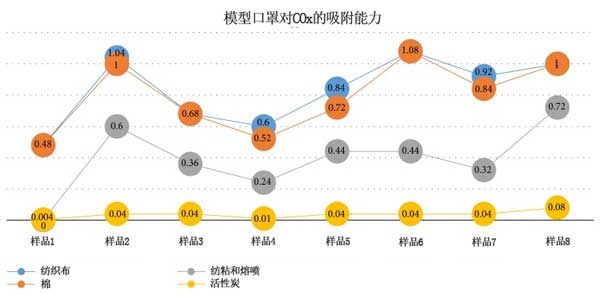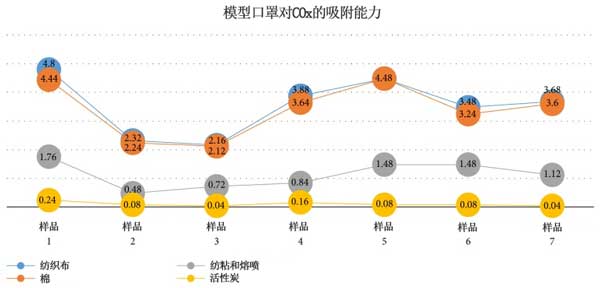 活性炭組合口罩模型組在吸收COx方面比其他口罩模型具有更高的能力。不使用口罩/控制3.40 ppm(吸入氣體)檢測COx廢氣排放的平均結果高于使用其他口罩,即棉布材料3.39 n/mm3,紡粘和熔噴1.13 ppm以及0.10ppm的活性炭組合材料,紡粘和熔噴的口罩(參見圖1)。