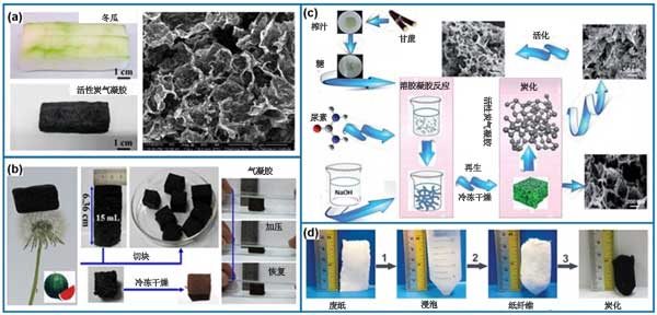 活性炭氣凝膠由納米結(jié)構(gòu)活性炭材料組成,其中孔隙充滿氣體。因?yàn)榭梢越Y(jié)合有益吸附性質(zhì)和高的熱穩(wěn)定性,并且擁有電子傳導(dǎo)性,和可成為催化劑載體,油或有機(jī)溶劑吸附和儲(chǔ)能方面的潛在應(yīng)用。活性炭氣凝膠還有一個(gè)特征是它們的超輕質(zhì)。除了高度多孔和輕質(zhì)之外,另一個(gè)優(yōu)點(diǎn)是在轉(zhuǎn)化成活性炭氣凝膠后引入導(dǎo)電性的可能性,因此允許在電化學(xué)區(qū)域(例如,電池,超級(jí)電容器或?qū)щ姶呋瘎┹d體)中的應(yīng)用。隨著新型活性炭材料的發(fā)展,已經(jīng)生產(chǎn)出具有超低密度和優(yōu)異導(dǎo)電性的石墨烯或基于納米碳管的活性炭氣凝膠作為新興的新型氣凝膠材料,這進(jìn)一步拓展了氣凝膠材料的應(yīng)用領(lǐng)域。除了高級(jí)碳材料能制造氣凝膠外,使用生物質(zhì)做成的活性炭氣凝膠如圖7所示。