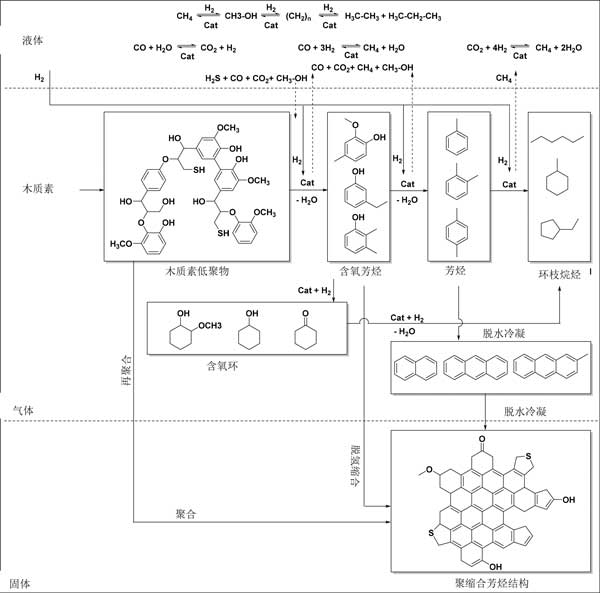 基于木質(zhì)素油的產(chǎn)物產(chǎn)率和組成,提出了一種用于加氫處理的反應過程。木質(zhì)素使用活性炭催化劑和氫氣(圖3)。它涉及在液相和氣相中發(fā)生的許多連續(xù)和平行反應。對低分子量烷基酚類和芳族化合物的所需反應涉及通過裂解鍵來對木質(zhì)素進行熱和催化解聚(加氫裂化)。最具反應性的連接是醚鍵,盡管這些在木質(zhì)素中不是很豐富。活性炭催化劑促進解聚反應,但在不存在活性炭催化劑的情況下的反應也產(chǎn)生(有限)量的木質(zhì)素油,表明熱解聚反應也起作用。低聚物片段可以進一步解聚成烷基酚類形式的低分子量化合物或再聚合(也與已形成的低分子量化合物一起)成更高濃度的結構,最終導致燒焦。后一種途徑可能是熱反應,因此可以通過使用非;顫姷幕钚蕴看呋瘎﹣硪种,所述催化劑通過催化隨后的轉化來減少活性中間體的量。中間低分子量烷基酚類在反應條件下不是惰性的,并且可以進一步加氫脫氧成芳族化合物和烷烴。