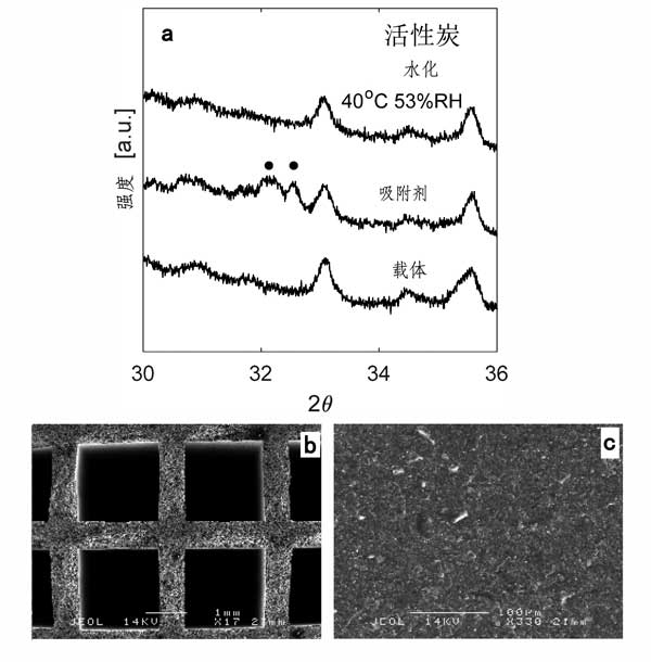 圖1a顯示了在40℃和相對(duì)濕度為53%下水合處理后活性炭載體,吸附劑和活性炭X射線衍射圖。由于碳酸鉀倍半水合物的反射特性的存在證實(shí)了鹽在載體上的負(fù)載。由于載體中加載的鹽量低,解釋了這些反射的低強(qiáng)度,5.58wt%。其余的峰對(duì)應(yīng)于載體中的不同相,例如碳和二氧化硅。圖1b顯示了活性炭載體的SEM照片。如圖中所看到的圖中,信道是正方形幾何形狀的具有每邊1.979±0.006毫米的長(zhǎng)度,并且所述通道之間的壁的厚度是0.651±0.022毫米。圖1c示出了通道的內(nèi)壁的表面上,他們看起來(lái)很同質(zhì)。