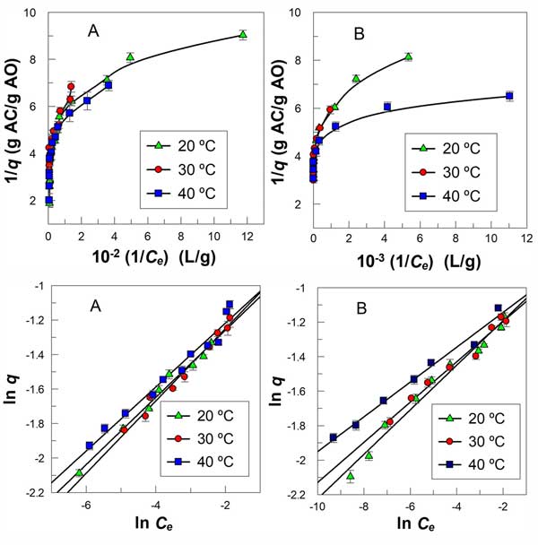 在不同的活性炭量下,評估了溫度(T=20–40°C)對沒食子酸和沒食子酸丙酯吸附過程的影響。實驗吸附平衡數(shù)據(jù)擬合到兩個等溫線模型,Langmuir和Freundlich方程,并評估了擬合優(yōu)度。圖2。在研究的交流范圍內(nèi)獲得了非線性圖。因此,結(jié)果表明該模型不適用于描述沒食子酸和沒食子酸丙酯在活性炭上的吸附。注意,在任何給定的活性炭質(zhì)量下,溫度的變化都會導致沒食子酸和沒食子酸丙酯的吸附能力發(fā)生非常小的變化,差異小于2%。