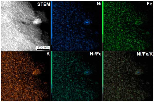 進行EDX映射以獲得有關(guān)顆粒的局部化學(xué)組成的更多信息。作為示例,圖2呈現(xiàn)了活性炭載鎳材料的EDX映射。如觀察到的圖2中,鎳和鐵,還鉀的存在下,在該材料檢測。這三種金屬的EDX映射的疊加顯示出完美的匹配,表明納米粒子結(jié)構(gòu)中存在所有這些金屬。除小顆粒外,還觀察到一個位于碳末端的大顆粒,并且鎳比其他金屬富集。對于活性炭載銅和銦在顆粒結(jié)構(gòu)中也發(fā)現(xiàn)了鉀的存在。