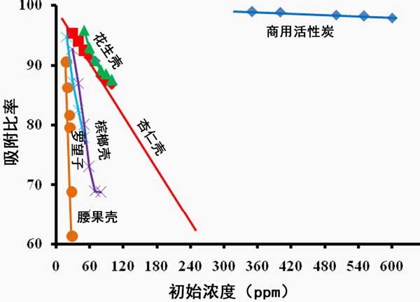 在不同的初始濃度下,對(杏仁殼,花生殼,檳榔殼,羅望子殼和腰果殼)活性炭和活性炭上的天青A染料去除程度進行分批吸附研究,在固定劑量,在室溫(30 ± 1 °C)下接觸時間為30分鐘。隨著初始濃度的增加,所有活性炭上染料的去除率趨于降低(圖1)。這可能是由于缺乏高初始濃度的天青A所需的可用活性位點所致。在較低濃度的天青A大量吸附了留下更多數(shù)量的活性部位的吸附劑,在較高濃度較小數(shù)量的活性位點仍然可用。