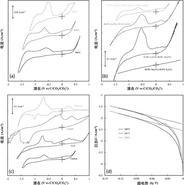 圖1:(a)活性炭的溫度,(b)發(fā)生沉積的熔融碳酸鹽電解質(zhì),以及(c)發(fā)生沉積的基板。(d)與在500-700°C的溫度下沉積的碳的碳沉積開始有關(guān)的Tafel峰的陰極Tafel曲線和計算的Tafel線(虛線)。