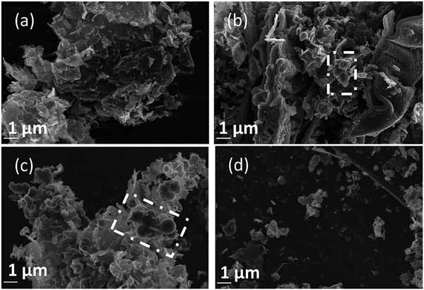 圖2:在其他標(biāo)準(zhǔn)條件下以20 kV放大倍數(shù)拍攝的碳沉積(a)0.15,(b)0.30,(c)0.60和(d)1.20 A cm-2時拍攝的SEM圖像。