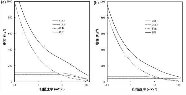 圖4:掃描速率對(a)以活性炭和其他標(biāo)準(zhǔn)條件以及(b)活性炭對總電容的貢獻(xiàn)的影響。C D表示由于擴(kuò)散引起的電容,而C DL1和C DL2分別表示與納米和微孔表面積以及外部碳表面積相關(guān)的雙層。