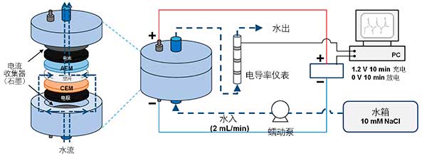 方案1中描述了用于檢查脫鹽性能的膜電容去離子系統(tǒng)。每個(gè)電極由作為集電器的石墨,交流電極和IEM組成。將陰離子交換膜和陽離子交換膜分別放在陽極和陰極上。一對(duì)電極由厚度為110 µm的尼龍墊片隔開。使用蠕動(dòng)泵將進(jìn)料水供應(yīng)到電解池。處理后的溶液直接流過電導(dǎo)率儀,隨后使用單程模式。除了IEM的存在外,還以與電容去離子中使用的相同配置進(jìn)行了CDI實(shí)驗(yàn)。使用電池循環(huán)器在1點(diǎn)分別施加電壓10分鐘。在充電步驟中為2 V,在放電步驟中為0V。從第三個(gè)循環(huán)獲得數(shù)據(jù),并從至少三個(gè)操作中計(jì)算出平均值,以實(shí)現(xiàn)可重復(fù)性。