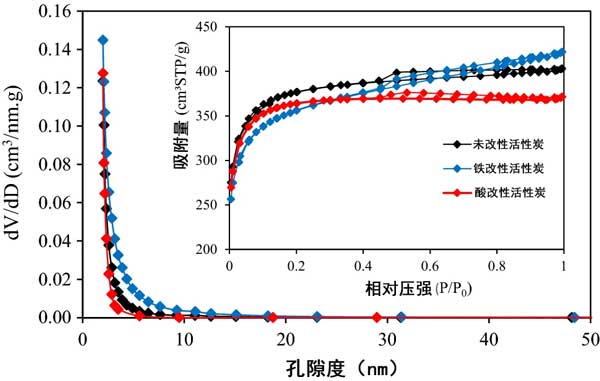 表面積和孔徑?jīng)Q定了吸附劑的吸附性能;钚蕴烤哂写罅康膬炔靠,具有較大的比表面積。HNO 3和Fe 對改性活性炭的BET表面積,BJH平均孔徑和孔體積均有不同程度的變化。在常溫條件下,濃HNO 3在活性炭表面溶解了一定的灰分,有助于進一步擴大多孔結構。但是,濃HNO 3還腐蝕了活性炭的結構,從而部分破壞了內部通道結構并降低了活性炭的比表面積。至于鐵改性的活性炭,內表面的鐵材料層堵塞了某些通道,從而降低了比表面積,平均孔徑和孔體積。