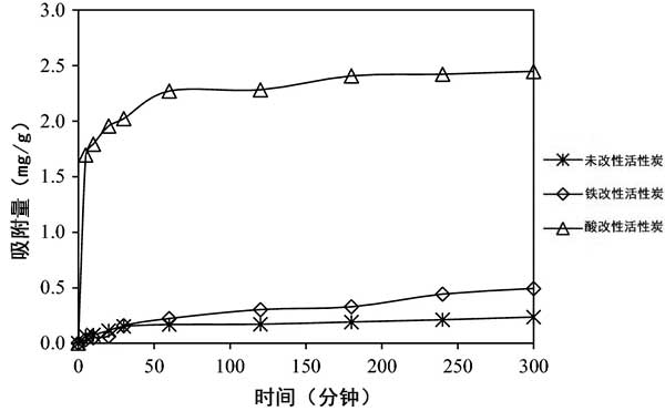 吸附動力學主要用于確定吸附過程的保留時間。圖3顯示了砷離子在活性炭纖維上的吸附動力學。如圖3所示 ,砷離子的吸附隨著接觸時間的增加而增加,并且考慮到處理效率,吸附平衡時間固定為60分鐘。與活性炭的吸附過程相比,F(xiàn)e和HNO 3改性后的活性炭吸附平衡時間增加,但在300分鐘時的吸附容量分別為0.236 mg/g,0.493 mg/g和2.45 mg/g。因此,鐵改性的活性炭提高了去除砷離子的吸附能力。