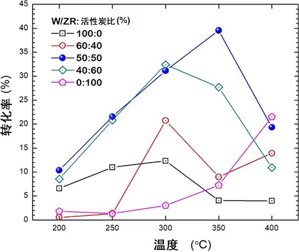 在第一部分中,我們比較了活性炭和氧化鋯單載體系統(tǒng)之間的性能;钚蕴繂屋d體顯示出高的重量比表面積,但仍低于合成為催化劑的活性炭。此外,其酸度高于氧化鋯的酸度,這被認為有利于酸催化的反應的活性。在圖1中,單載體催化劑的比較表明,在450-C的溫度下,W/ZR的轉化率高于W / 活性炭,而W / 活性炭在450°C時的轉化率比W/ZR高。W/ZR:活性炭的60:40和40:60在300°C時表現出最大的轉化率,分別約為21%和33%。我們發(fā)現,最高的轉化率是由350:50的50:50 W/ZR:活性炭催化劑產生的。