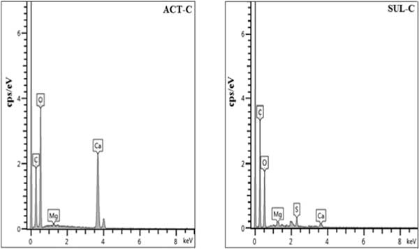 各種尺寸的活性炭和磺化炭的SEM圖像形態(tài)如圖1所示。。ACT-C和SUL-C催化劑的SEM圖像表明,白點(diǎn)代表無機(jī)成分。從圖像可以看出,活性炭具有不規(guī)則的致密結(jié)構(gòu),而顆?雌饋硐窬哂泄饣砻娴念w粒。圖2顯示了ACT-C和SUL-C催化劑的EDX圖,并觀察到SUL-C圖中存在硫。此外,在ACT-C和SUL-C的圖中,還有一些額外的峰涉及雜質(zhì),因?yàn)樘荚词菑U物生物質(zhì),因此可能存在這些雜質(zhì)。如圖3所示,通過TEM分析了活性炭和磺化炭的形態(tài)和結(jié)構(gòu)。該TEM圖像ACT-C催化劑的“A”表示僅存在微孔,而SULC催化劑則顯示了“微孔”和“中孔”,這是由于活性炭材料上的磺化作用所致,在活性炭材料中產(chǎn)生了中孔。