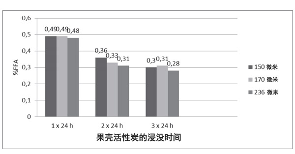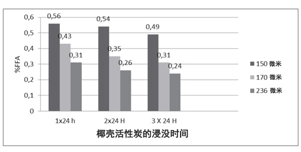 可以得出結(jié)論,使用活性炭長時間的浸泡和小的顆粒尺寸效果比較好。另外,浸漬時間,粒度和活性炭吸附劑類型對減少食用油的游離脂肪酸數(shù)量有影響。