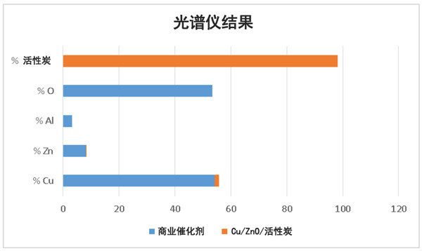 活性炭催化劑的制備,采用浸漬法制備了Cu/ZnO/活性炭催化劑。硝酸銅和硝酸鋅是將附著在活性碳上的銅和氧化鋅載體的原材料。Zn起促進(jìn)劑的作用,以防止Cu的燒結(jié)。銅將在催化劑上被氧化并寫為銅[Zn]。之后,來自CuO分子將為CuO/ZnO相的形式。其還原將受到ZnO的影響。制備活性炭催化劑后,然后通過XRF,XRD,SEM和BET表面積分析儀對(duì)催化劑進(jìn)行表征。商業(yè)催化劑和Cu/ZnO/活性炭催化劑的XRF分析見圖2。