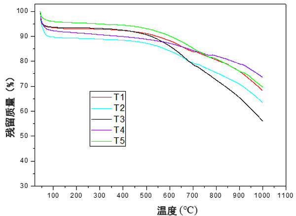 根據(jù)圖3,不同的處理導(dǎo)致熱分解曲線有所不同。此外,不同處理的殘留質(zhì)量也有所不同,處理T1,T4和T5呈現(xiàn)更高的殘留質(zhì)量,表明這些處理具有更高的耐熱性。處理T2和T3的殘留量較低,表明處理的耐熱性較低。此外,這些處理在后期殘留質(zhì)量之間存在重大差異而脫穎而出。根據(jù)處理(電擊時(shí)間),降解曲線的差異可能與表面上不同官能團(tuán)的存在有關(guān)。在熱過(guò)程中,由于存在的官能團(tuán),會(huì)形成不同的產(chǎn)物,從而導(dǎo)致更高或更低的質(zhì)量損失,因?yàn)榛钚蕴康臒岱纸夥磻?yīng)了其表面上官能團(tuán)的存在。然后,官能團(tuán)的類型和數(shù)量都會(huì)影響熱重曲線。但是,由于表面官能團(tuán)的降解與其結(jié)構(gòu)不同,因此官能團(tuán)的類型具有更大的影響,并且可以解釋處理之間的差異。