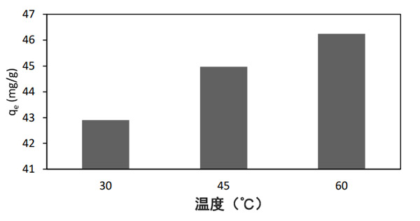溫度對吸附過程有顯著影響,因為溫度的變化會引起吸附劑對特定吸附物的平衡吸附能力的變化。因此,如圖3所示,通過將溶液溫度從30-60°C改變來研究溶液溫度對染料去除的影響。隨著溫度從30-60升高,對甲基黃的吸附容量從42.9 mg/g增加到46.2 mg/g。溫度表明吸附反應(yīng)本質(zhì)上是吸熱的。眾所周知,由于溶液粘度的降低,溫度升高會增加被吸附物分子在外邊界層以及在活性炭顆粒內(nèi)部孔中的遷移率或擴散速率。