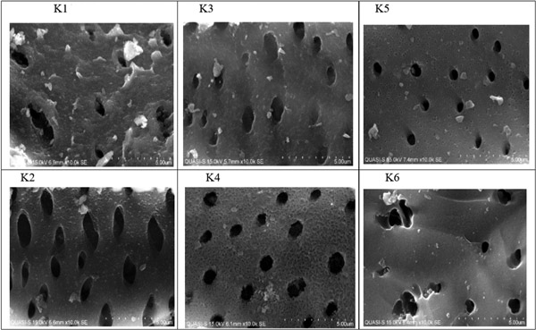 對(duì)原始活性炭(圖3中的K1)的掃描顯示出相當(dāng)均勻的孔。活性炭的結(jié)構(gòu)可以看作是薄片,為不規(guī)則分布和各種尺寸的孔提供了較大的吸附面積。表面上的大多數(shù)可見(jiàn)孔都在5微米范圍內(nèi),這與對(duì)椰殼活性炭的預(yù)期一致,而在這5微米孔內(nèi)可以看到小于1微米的較小孔。圖3中的K2顯示了在氯酸鹽吸附到表面活性部位后活性炭表面的變化。這些孔有變化的跡象,因?yàn)槠渲幸恍┪铰人猁},而其他孔被氯酸鹽和氯化物分子阻塞。在10,000倍的放大倍率下,可以觀察到小孔周圍和大孔入口處的沉積,因?yàn)轭A(yù)計(jì)表面活性基團(tuán)會(huì)大量存在于這些區(qū)域;钚蕴康乃嵝栽偕鷺O有可能形成了表面活性部位,從而增強(qiáng)了活性炭吸附大量氯酸鹽的能力。