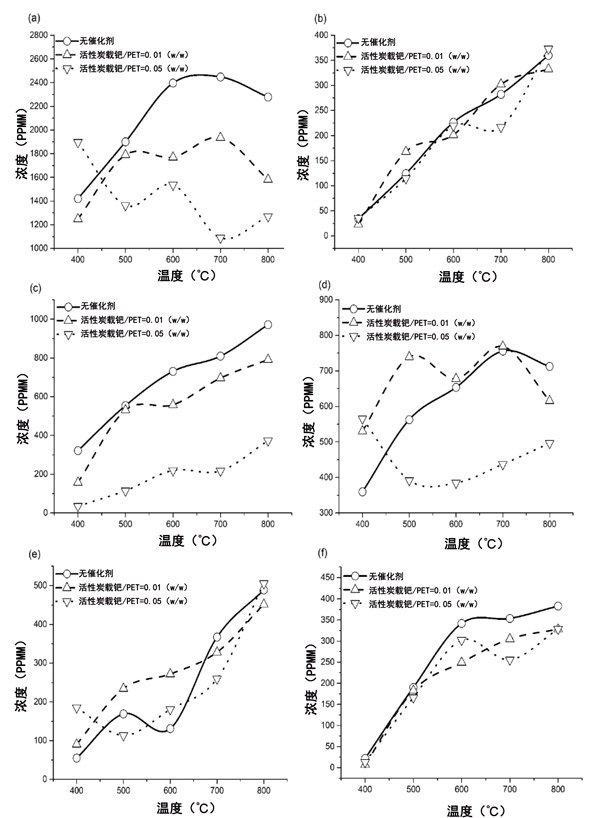圖2:在有和沒(méi)有活性炭載鈀催化劑的條件下,聚對(duì)苯二甲酸乙二酯熱解過(guò)程中總胺衍生物的濃度隨溫度的變化。