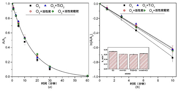 圖2給出了紡織原料廢水的臭氧化和催化氧化結(jié)果?梢钥闯觯琓iO 2,活性炭或載鉑活性炭催化劑均未產(chǎn)生任何可見(jiàn)的催化活性。收集所有催化劑的實(shí)驗(yàn)數(shù)據(jù),作為在596 nm處的吸光度值,它對(duì)應(yīng)于活性黑5染料(RB5)的顏色,可以通過(guò)相同的趨勢(shì)線粗略地近似(圖2a)。相應(yīng)地,計(jì)算出的除色偽一級(jí)反應(yīng)速率值對(duì)于所有催化劑幾乎都相同,并且不高于單次臭氧化(圖2b)。由于缺乏任何催化劑的催化作用,可以用紡織廢水基質(zhì)來(lái)解釋。問(wèn)題的共同點(diǎn)是催化劑的吸附能力。即使每種測(cè)試的催化劑的特征在于不同類(lèi)型的吸附活性中心,所有這些催化劑都可能被表面活性劑的殘留物失活,這種表面活性劑通常在紡織品的工業(yè)染色操作中作為助劑使用,并建立了這種催化劑的基質(zhì)。