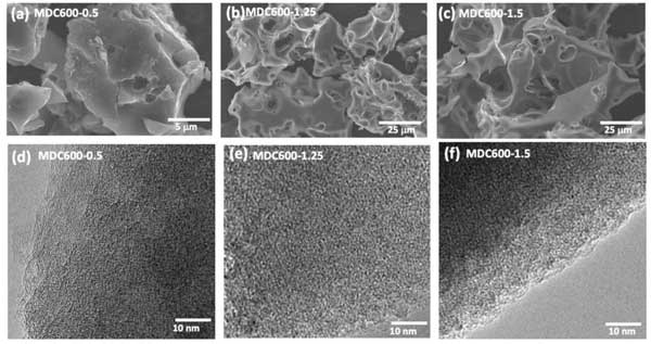 活性炭吸附劑是通過兩步熱解過程制備的,該過程包括將奶粉轉(zhuǎn)化為生物炭,然后在高溫下用堿活化。同時還增加了細(xì)微的差別,即涉及一種輔助化學(xué)或物理試劑,可在材料上蝕刻出納米級的孔隙。牛奶由多種蛋白質(zhì),脂肪和礦物質(zhì)組成。有特別地酪蛋白蛋白(一種磷酸蛋白家族)以膠束的形式存在于牛奶中,通過疏水相互作用,氫鍵結(jié)合以及膠束核心內(nèi)磷酸鈣納米簇的橋接而在內(nèi)部得到穩(wěn)定。圖1正是這些磷酸鈣-酪蛋白蛋白簇充當(dāng)碳的3D結(jié)構(gòu)發(fā)展的模板,因為它們在熱解的初始階段得以保存,在此階段奶粉被加熱到400°C,并防止活性炭內(nèi)結(jié)構(gòu)塌陷。在第二個活化步驟中,堿KOH與碳反應(yīng)生成碳酸鉀,碳酸鉀分解并留下富氮和富氧的微孔。所得的活性炭顯示出有效且可逆地捕集二氧化碳,同時排除了水蒸氣。