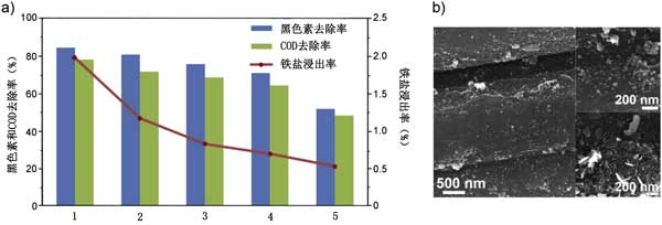 檢查了活性炭催化劑的可重復使用性,以評估其是否經(jīng)過了多個循環(huán)的黑色素處理。圖3顯示了五個處理周期的COD和脫色以及鐵浸出的結果。一個。盡管觀察到4個循環(huán)后,脫色效率從85%逐漸降低到70%,但是,可以證明活性炭催化劑在Fenton反應中具有合理的可重復使用性。效率的降低可歸因于吸附降解副產(chǎn)物時某些催化劑位點的失活以及在Fenton反應過程中少量鐵的浸出。在每個循環(huán)后對鐵的浸出進行了研究,以表明活性炭的穩(wěn)定性。如圖3所示a,在第一個循環(huán)中浸出鐵離子的量最高,約為初始鐵量的2%。在第三個循環(huán)后,浸出鐵降至<1%,并且在隨后的循環(huán)中保持穩(wěn)定,在第五個循環(huán)時降至0.5%。與將鐵離子浸入溶液中的單獨的納米零價鐵相比,在Fenton類工藝中,亞鐵離子和鐵離子可能會被活性炭吸附/螯合,從而避免了浸出并使反應連續(xù)供入。零碎的鐵損失顯然是活性炭催化劑再利用以及減少鐵淤渣的重要步驟。
