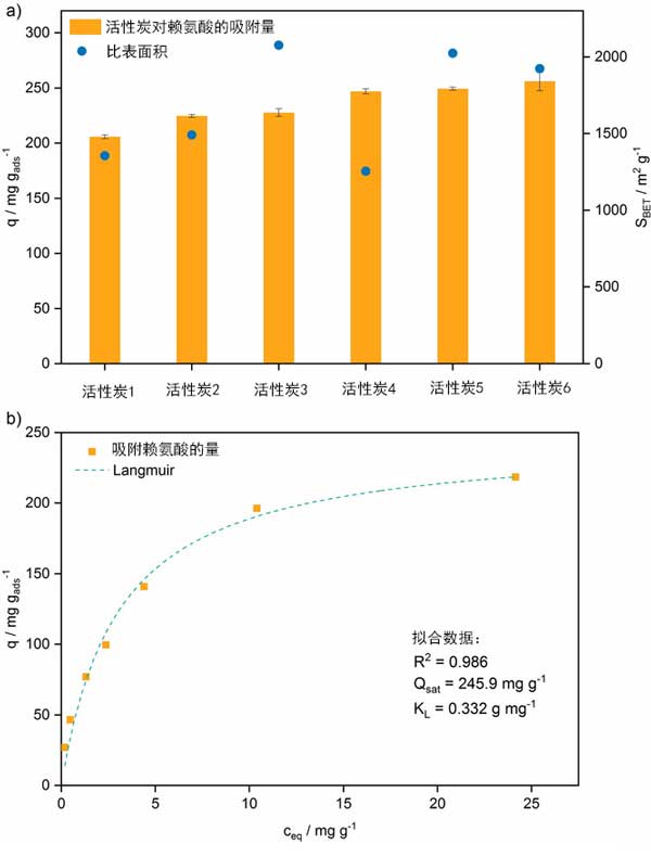 圖1:a、使用具有相應(yīng)表面積的市售活性炭吸附的賴氨酸量。誤差線對(duì)應(yīng)于從三次重復(fù)實(shí)驗(yàn)確定的標(biāo)準(zhǔn)偏差。b、賴氨酸在Langmuir吸附等溫線模型上的吸附等溫線。